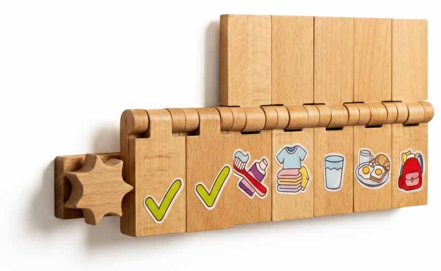 A wooden board that helps kids follow daily routines.